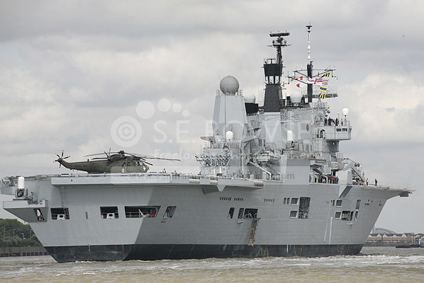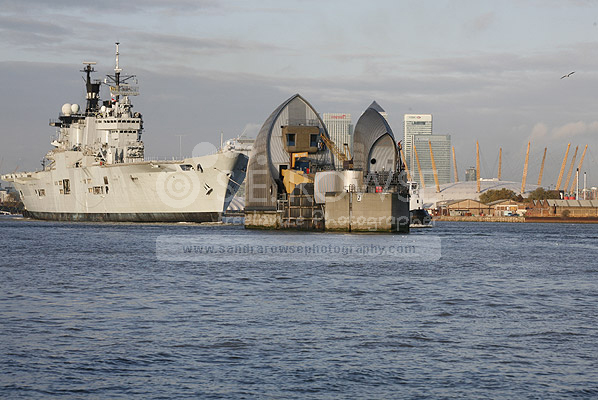 HMS Ark Royal ahead the Thames Barrier