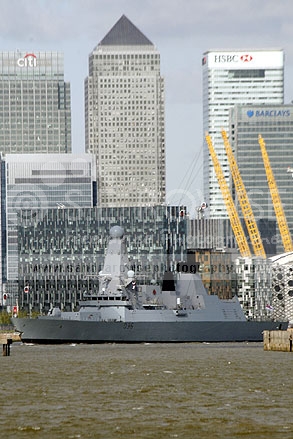 HMS DEFENDER passes Canary Wharf London