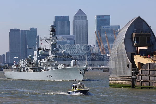 HMS PORTLAND approaches the THAMES BARRIER